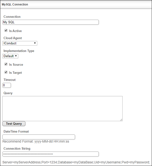 A string that specifies information about a data source and the means of connecting to it. Refer to this page for more information about connection strings. Example: Server=myServerAddress;Port=1234;Database=myDataBase; Uid=myUsername;Pwd=myPassword; |