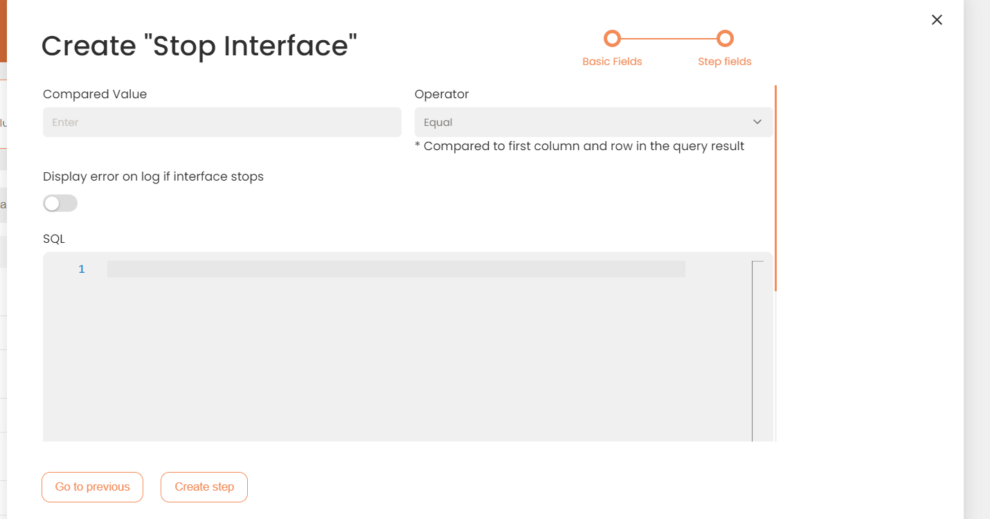 The Stop Interface algorithm allows you to stop the interface execution by comparing the query result with a predefined value.
